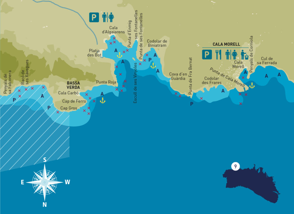 Cala Morell se encuentra al abrigo de todos los vientos menos los del cuarto cuadrante. Tiene suficiente profundidad para fondear barcos pequeños. A 200 metros, a 300º de la Punta des Frare Bernat, se encuentra un bajo de piedra con un fondo mínimo de 0,9 metros. A 400 metros de distancia de la Punta de Cala Morell y al N está el Bajo Morell, un fondo de piedra con 5,5 metros de agua encima.